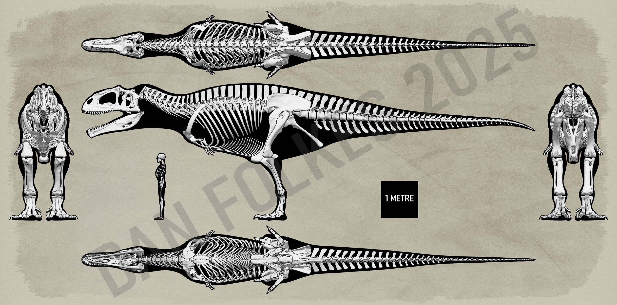 Missing elements were restored using Meraxes, Taurovenator, Mapusaurus, Carcharodontosaurus, and Acrocanthosaurus.