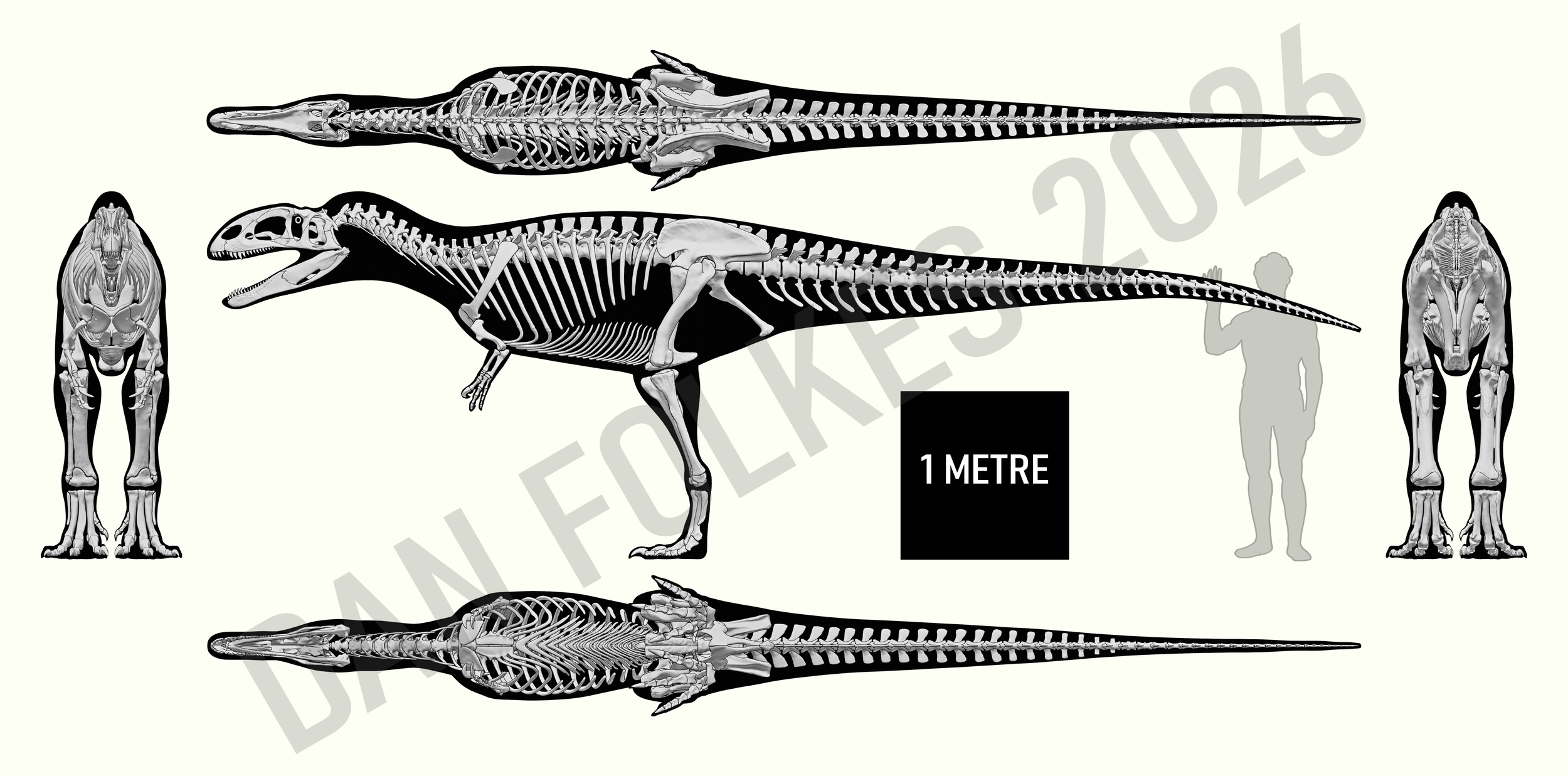 Neovenator salerii 3D reconstruction. Scale bar = 1 metre. Size is based on the holotype specimen.